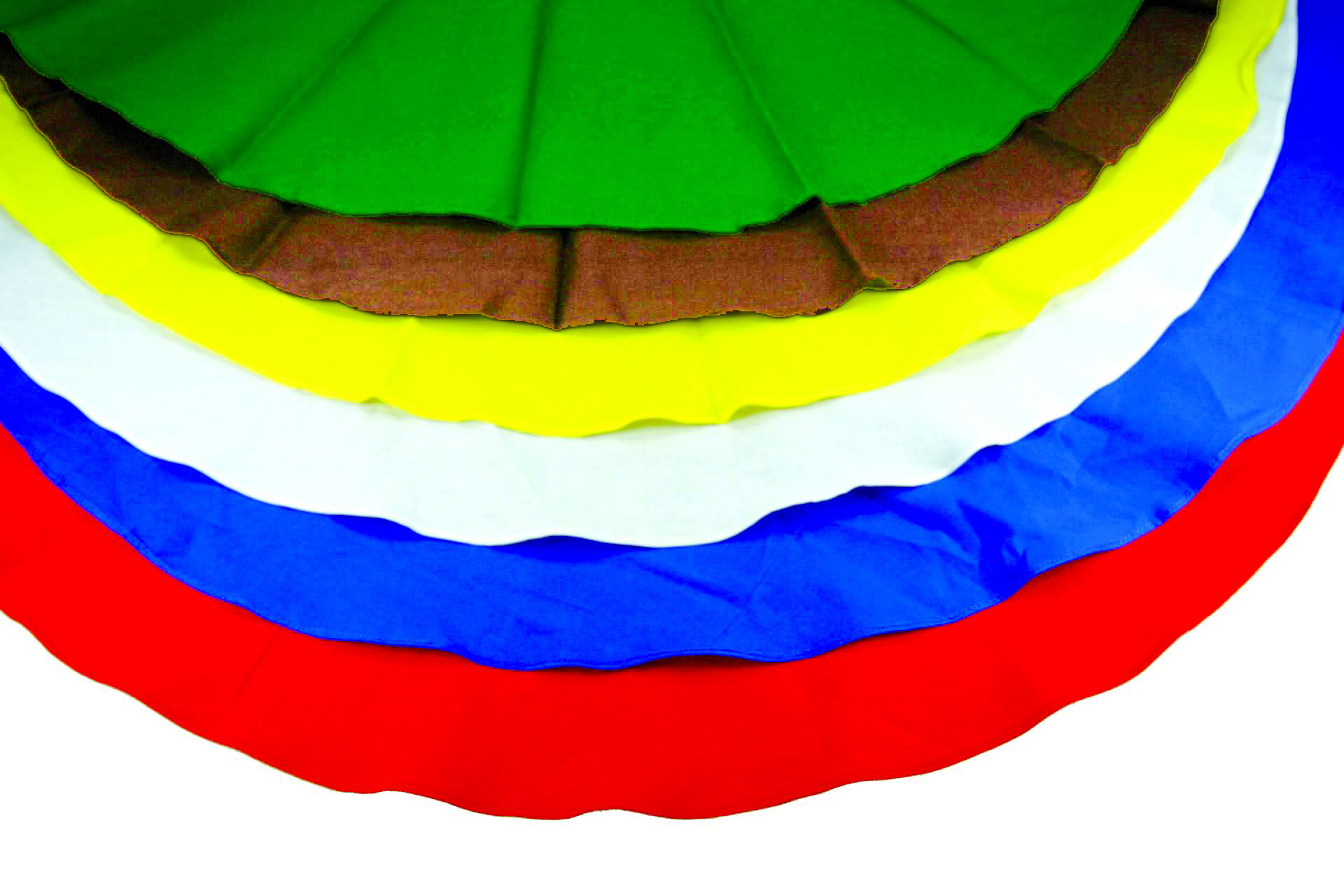 Das Set besteht aus Tüchern in den Farben rot, blau, weiß, gelb, braun (was auf dem Bild so nicht zum Ausdruck kommt) und grün.