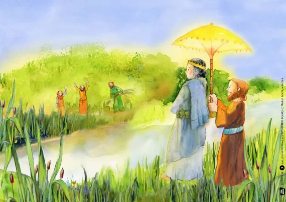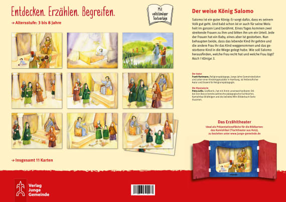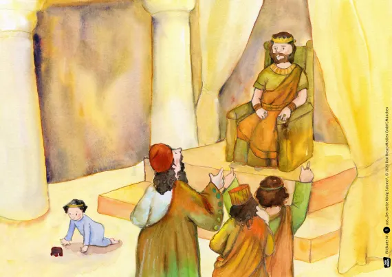 Salomo ist ein guter und weiser König. Eines Tages kommen zwei Frauen zu ihm, die von ihm verlangen, er solle über ihre Angelegenheit das Urteil fällen: Beide Frauen wohnen nah beieinander. Sie haben fast zur gleichen Zeit ein Kind geboren. Doch eines stirbt in der Nacht. Die Mutter des toten Kindes tauscht ihr totes Kind heimlich mit dem der anderen Frau. Doch die bemerkt es und die beiden Frauen geraten darüber in großen Streit. Beide sagen: "Ich bin die Mutter." Salomo fällt wie gewünscht ein Urteil - doch das ist furchtbar ...