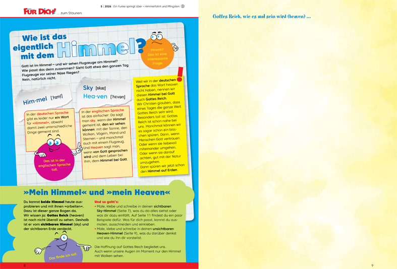 - Aktion: Wie ist das eigentlich mit dem Himmel? – Unterscheidung zwischen sichtbarem Himmel (sky) und unsichtbarem Himmel (heaven; Gottes Reich)