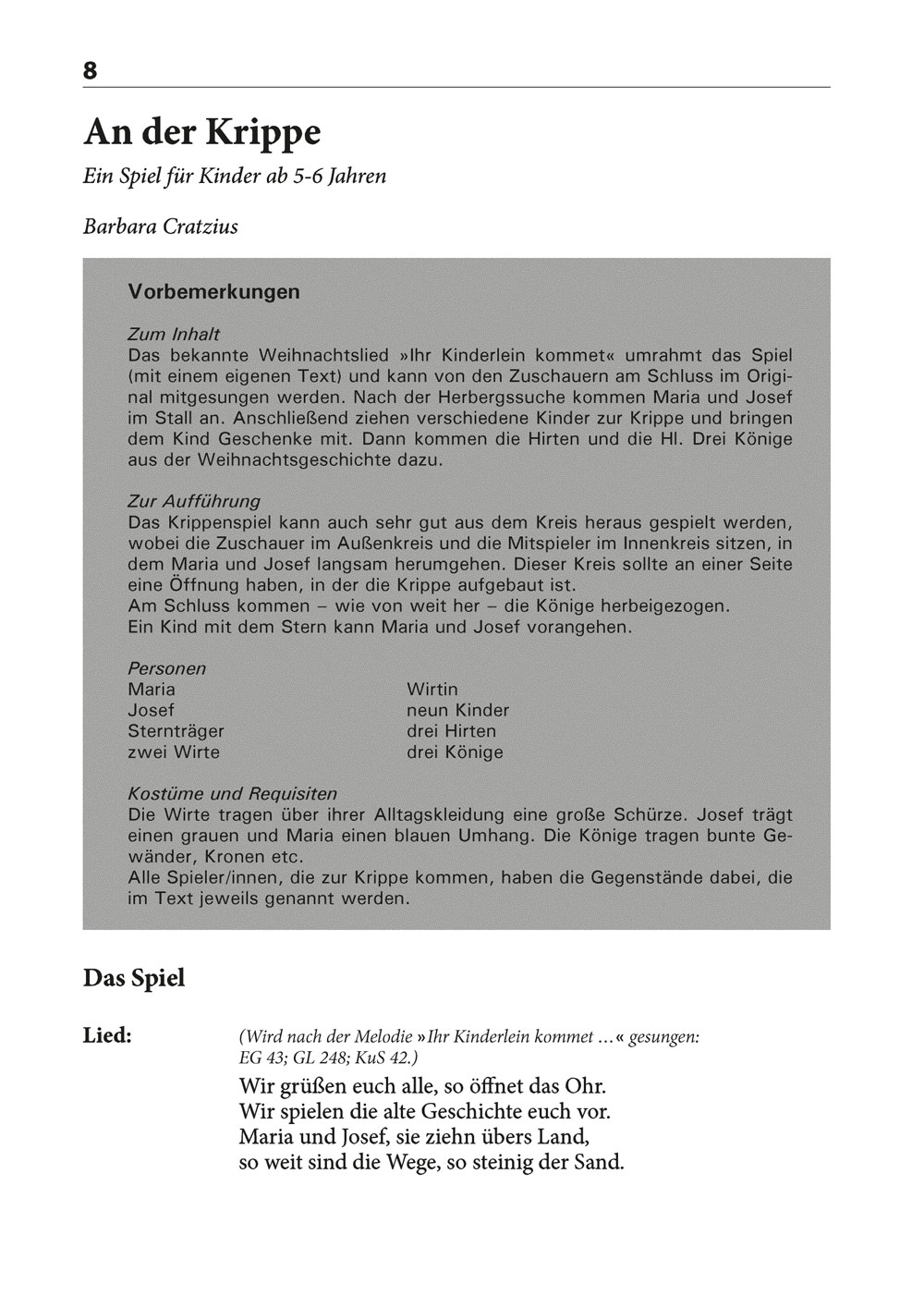 Das Buch enthält ein breites Spektrum an Weihnachtsspielen: kurze Szenen aus der biblischen Weihnachtsgeschichte, längere Krippenspiele, Singspiele, für kleine Gruppen und große. So können alle Kinder ab 4 Jahren mitmachen, wenn die Geburt Jesu auf die Bühne gebracht wird. Egal ob beim adventlichen Morgenkreis im Kindergarten, bei Weihnachtsfeiern in der Schule, im Familiengottesdienst oder bei der Kinderkirchfeier am Heiligen Abend.